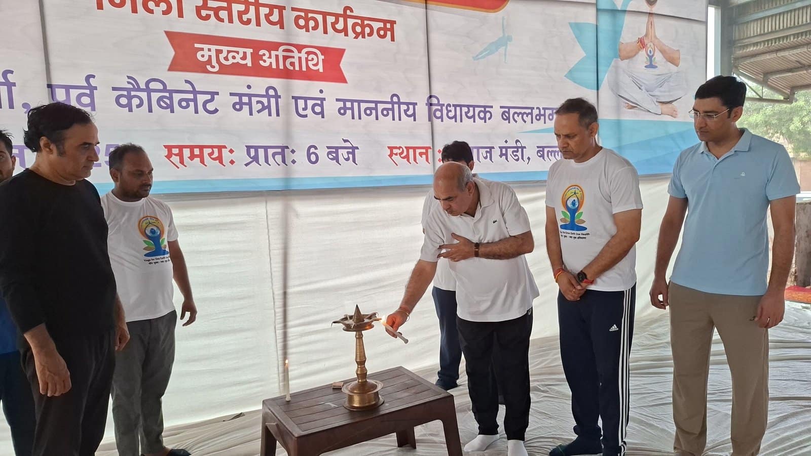 बल्लभगढ़, जून | अंतर्राष्ट्रीय योग दिवस के उपलक्ष्य में आज बल्लभगढ़ की अनाज मंडी में एक विशाल योग शिविर का आयोजन किया गया, जिसमें मुख्य अतिथि के रूप में स्थानीय विधायक एवं पूर्व कैबिनेट मंत्री पं. मूलचंद शर्मा ने शिरकत की।