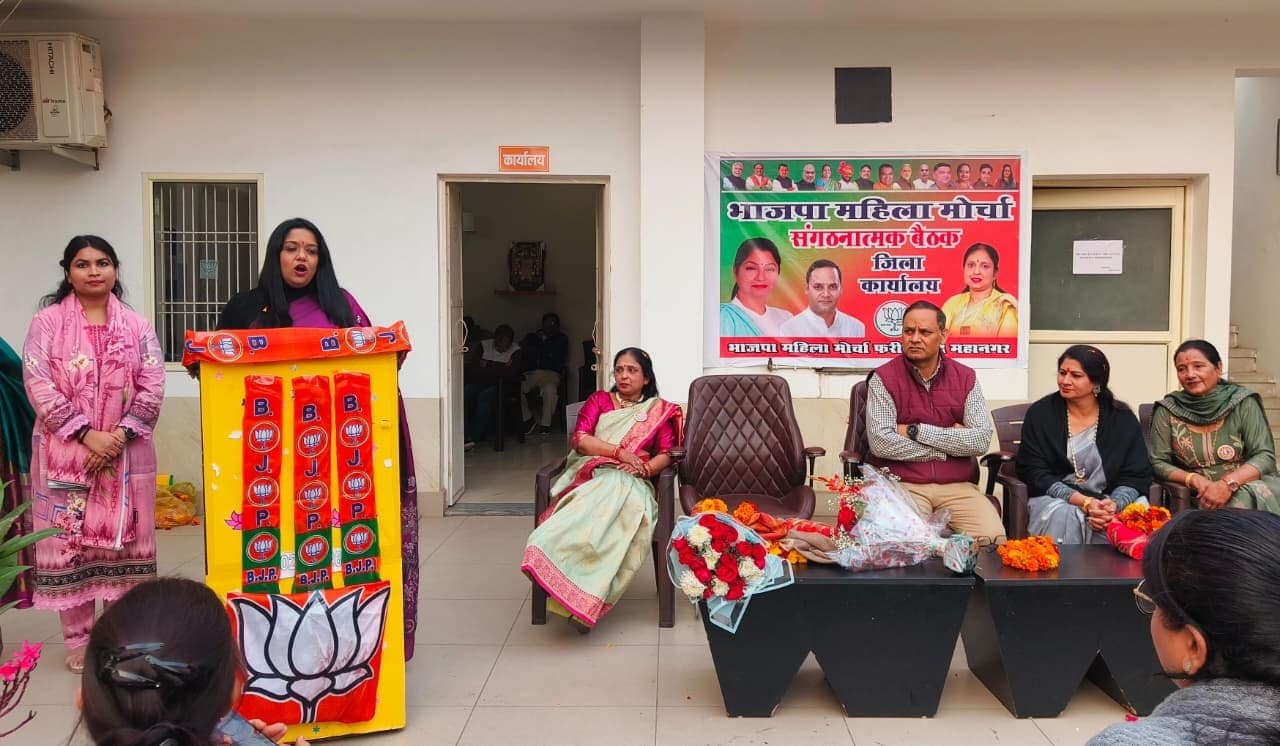 फरीदाबाद | भारतीय जनता पार्टी फरीदाबाद महानगर महिला मोर्चा की एक प्रभावशाली संगठनात्मक बैठक का आयोजन किया गया, जिसकी अध्यक्षता संगठनात्मक अध्यक्ष श्रीमती ममता राघव ने की। बैठक में फरीदाबाद महानगर जिला अध्यक्ष श्री सोहन पाल सिंह जी एवं श्री अनुराग गर्ग विशेष रूप से उपस्थित रहे। कार्यक्रम में मुख्य अतिथि के रूप में जिला प्रभारी श्रीमती आशा गगन गोयल एवं प्रदेश कार्यालय सचिव श्रीमती अनीता शर्मा जी की गरिमामयी उपस्थिति रही।