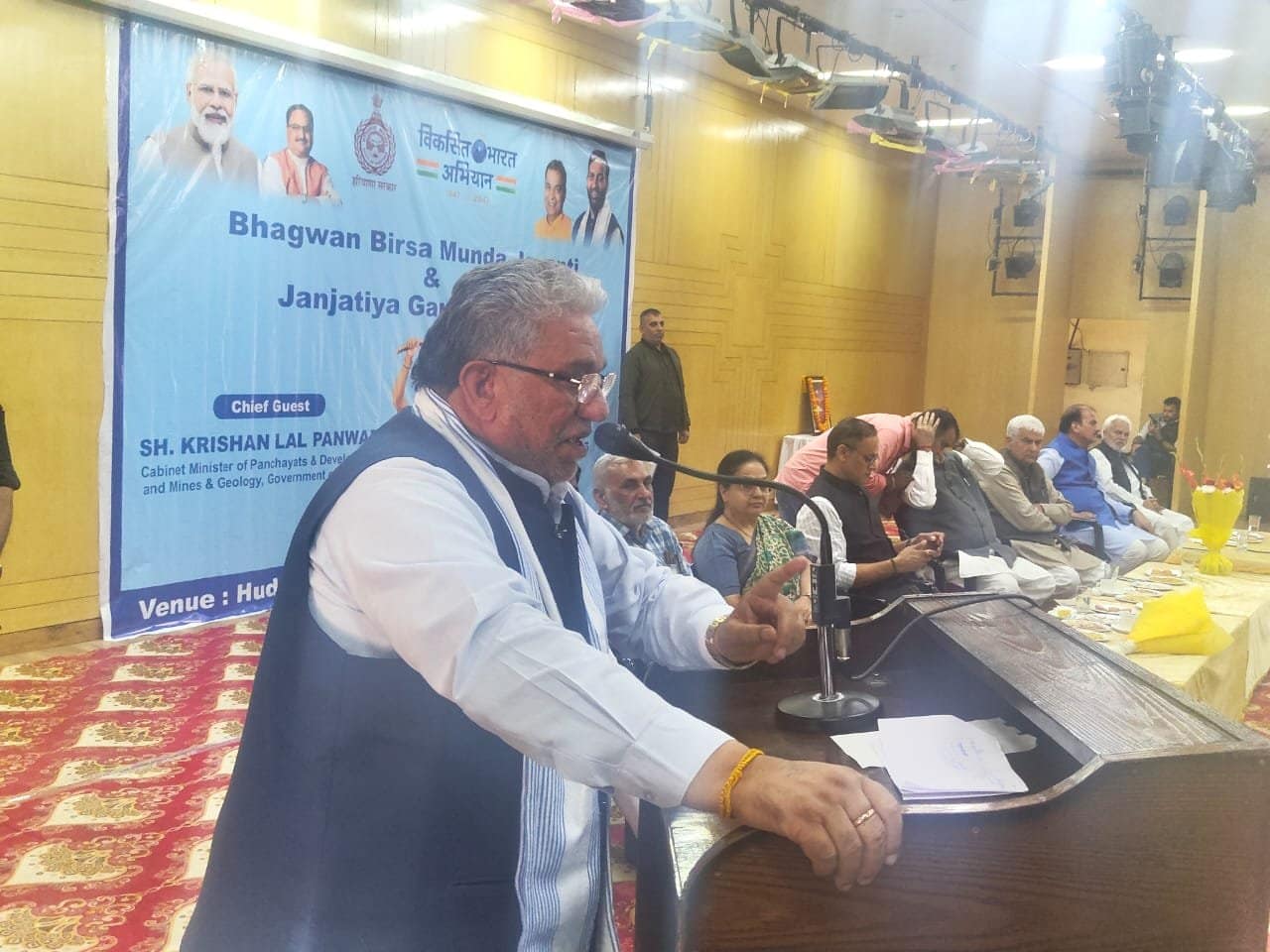 कैबिनेट मंत्री कृष्ण लाल पंवार ने भगवान बिरसा मुंडा की जयंती एवं जनजातिय गौरव दिवस पर फरीदाबाद के सेक्टर.12 स्थित कनवेंशन सेंटर में आयोजित कार्यक्रम में मुख्य अतिथि के रूप में शिकरत की। इस अवसर पर बल्लभगढ़ से विधायक एवं पूर्व मंत्री मूलचंद शर्मा भी विशेष रूप से मौजूद रहे। मंत्री कृष्ण लाल पंवार ने भगवान बिरसा मुंडा के चित्र पर पुष्प अर्पित कर नमन किया। वहीं फरीदाबाद में स्थापित वनवासी कल्याण आश्रम के लिए 11 लाख रुपये देने की घोषणा भी की। कार्यक्रम के दौरान वनवासी कल्याण आश्रम के विद्यार्थियों ने वनवासी वीरों की गाथा… सुनाकर उनके बलिदान और संघर्ष से रूबरू करवाया।